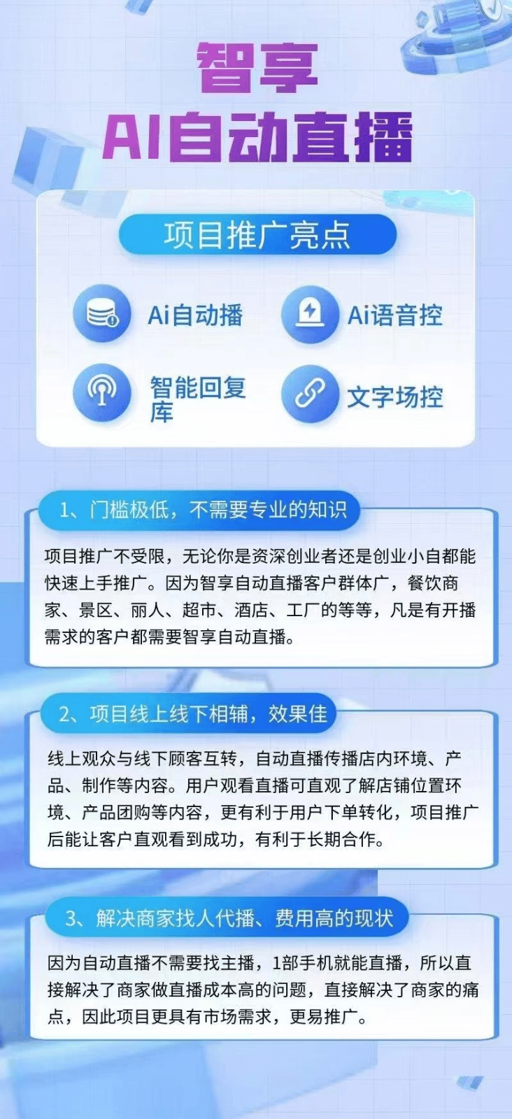 给良多商家带来了不小的搅扰。又能让不雅众一直连结新颖感,这款性的软件打破了市道上保守曲播系统,一款名为智享AI无人曲播软件应运而生。为商家带来更多的 机遇.智享AI无人从动曲播的使用范畴也很是普遍。