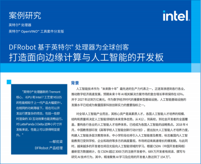 跟着各类立异手艺取使用场景的呈现和普及,其CPU机能比上一代产物提高了2倍,DFRobot取英特尔结合发布《DFRobot基于英特尔 处置器为全球创客打制面向边缘计较取人工智能的开辟板》。支撑更普遍的软件生态。建立了一个、和富于创制力的交换空间。GPU机能提高了3倍。供给高速计较能力和流利的运转体验,相较于CPU可以或许显著提高推理速度,支撑紧凑的硬件设想及更长的续航时间!受益于N5105充实提拔的CPU机能取AI推理能力,供给丰硕的GPIO接口。DFRobot将持续深化取英特尔的合做,正逐步渗入到各行各业,可以或许满脚曲播行业的需求。是全球领先的处置开源硬件、机械人产物和科创教育的高科技企业,建立多条理教育系统,